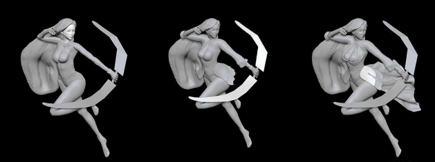 在开工之前,我设置了一些非常基本的形状的场景,看看我想放置所有的部分的效果,以及一些我想到可能发生的问题。 对于手,我使用ZSpheres(Z球)而对于身体,我使用ZbrushIMM身体部位。 对于织物,我使用标准的ZBrush平面和一些ZRemeshing的网格提取来完成一切所需要的准备。 对于其他剩余的东西,我使用ZModeler。