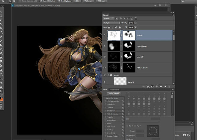 那么,我开始在Photoshop里组合不同的层,进行挑选和选择不同的部件,并清理我不需要的额外部分。 我混合了一个阴影层,AO层,绘画层等。 为了可以进行进一步的改进,我改变了线性减淡,正片叠底,滤色,叠加等等的层,这一部分需要反复在他们还之间尝试。