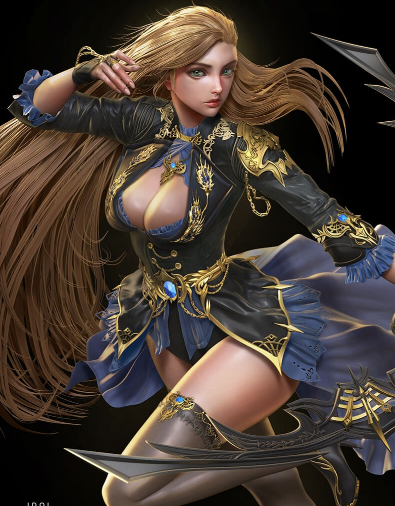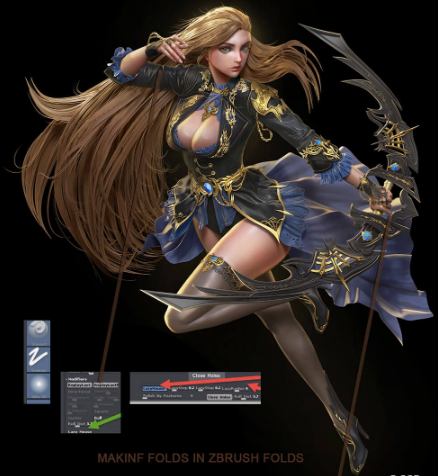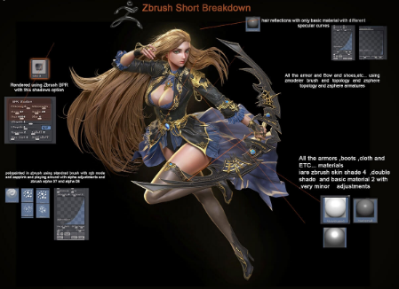 我使用低RGB强度的标准刷开始在ZBrush内部绘制模型,并使用ZBrush默认alphas的彩色喷涂来绘制这个角色,还可以进行聚光灯投影。 我使用ZBrush双色材料,基础材质和皮肤色调,这一切使得金色,皮革,皮肤和织物材料非常容易地完成。设置好规格,漫反射和反射率值。 有一篇关于在ZBrush中制作材料的更深入的文章,您可以在这里阅读。