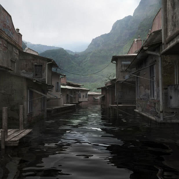 剩下的工作是用photoshop软件完成的,在这里继续制作材质。我还绘画了一些多余的部分,比如悬挂在建筑物上的绳子和一些房子后面枯死的树木。枯死的树木和背景中欣欣向荣的生态环境形成了鲜明的对比,我认为这样可以帮助提高场景的诡异效果。最后的润色我使用了curves图层来获得与场景和背景故事相匹配的氛围(图07)。