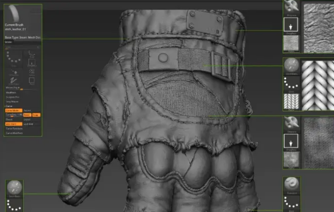 对于任何一种雕刻,我都会使用我最喜欢的一组画笔:clay tube、 dam standard, pinch and inflat笔刷结合一些Alpha。另外,我有一些针脚的插入笔刷。对于衣服和皮革,我使用Alpha作为基础,并在上面雕刻,以获得更自然和更丰富的变化。所有的电线、小带子和扣环都是在Softimage XSI中完成的,并导入到ZBrush中。
