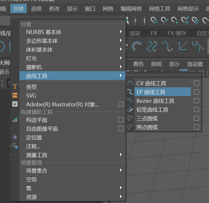 5、点击创建-曲线工具-EP曲线工具,创建一个PE曲线,也可以在工具栏中点击曲线/曲面。