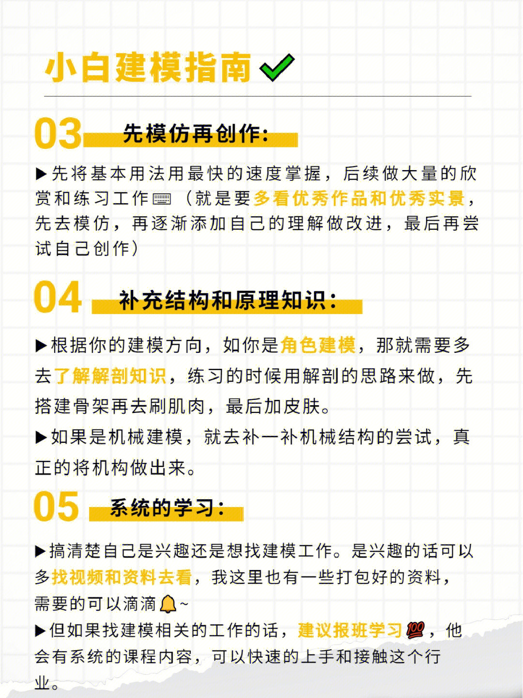 ▪️搞清楚自己是兴趣还是想找建模工作❗️是兴趣的话可以多找视频和资料去看,我这里也有一些打包好的资料,需要的可以滴滴😍~
