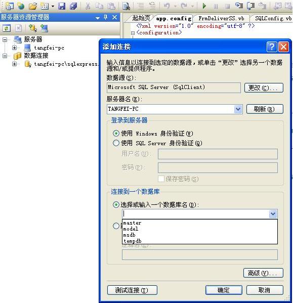 服务器名就要和上面的一致。否则在选择或输入一个数据库名的时候就会出现这个问题了。比如你选择了tangfei-pc\sqlexpress