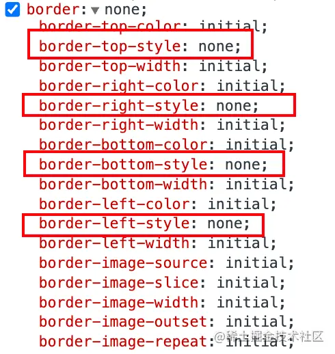 图中可以看到,border: none 其实就是把 border-style 设置成了 none,大家都知道 transition 对于 border 的过渡动画其实是针对 border-color 和 border-width 的,但如果 border-style 都没有,那还怎么看得到过渡动画呢?