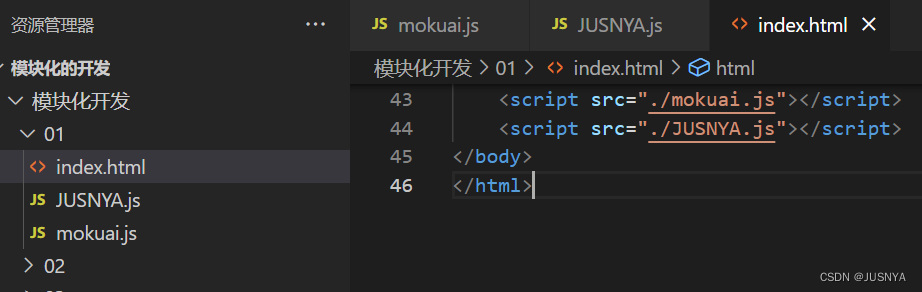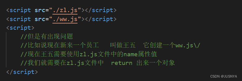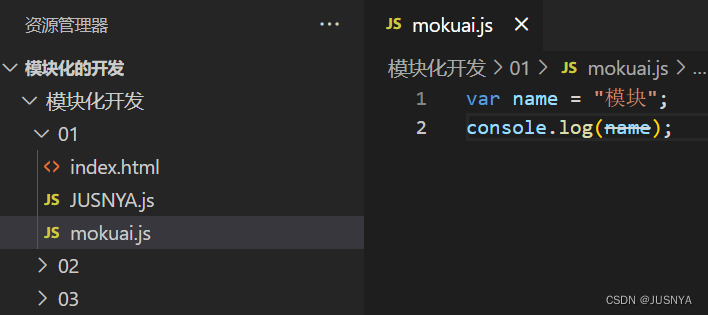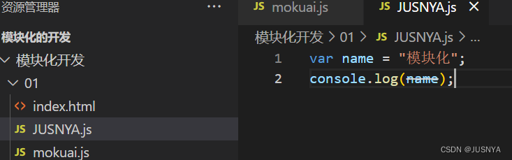 // 现在就是我们给 mokuai 文件中的变量加上一层作用域 给 JUSNYA文件中的变量加上一层作用域