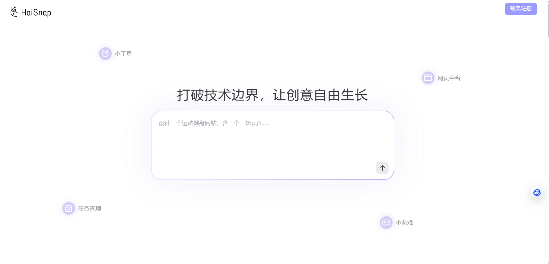 当你说 “做个帮宠物店老板自动生成萌宠朋友圈文案的工具”,HaiSnap会调用预置AI模型,生成带前端界面+API后端的完整应用,一键部署到云端。