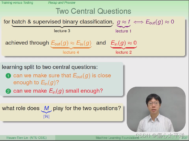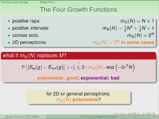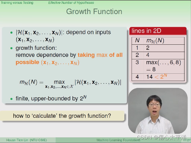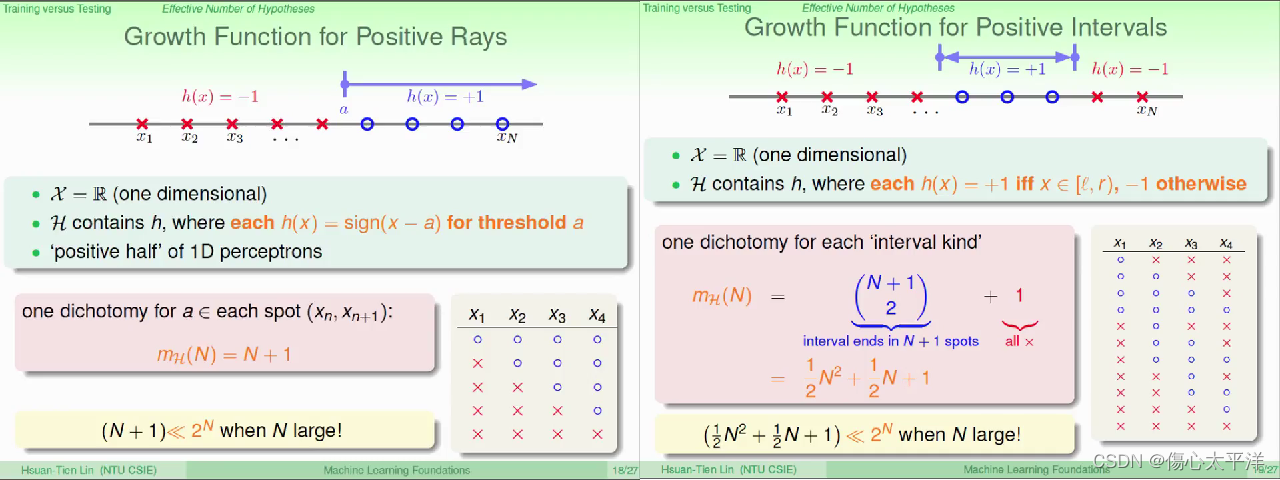 本文探讨了机器学习中两个核心问题:如何确保学习有效性及减少泛化误差。介绍了有效假设数的概念,解释了其在Perceptron模型中的应用,并通过增长函数深入分析不同假设空间的增长特性。