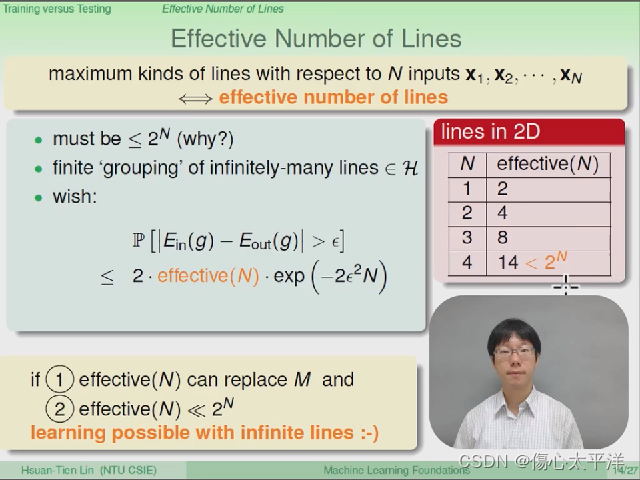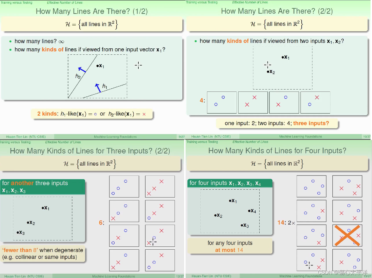 - 将 h 对 N 个数据的分类结果的种类数量,称为 "有效直线数量"