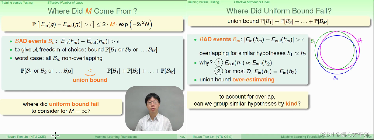 - 如果有 M 个 h,则至少一个 h 发生坏事的几率,可用 Union bound 得出:
