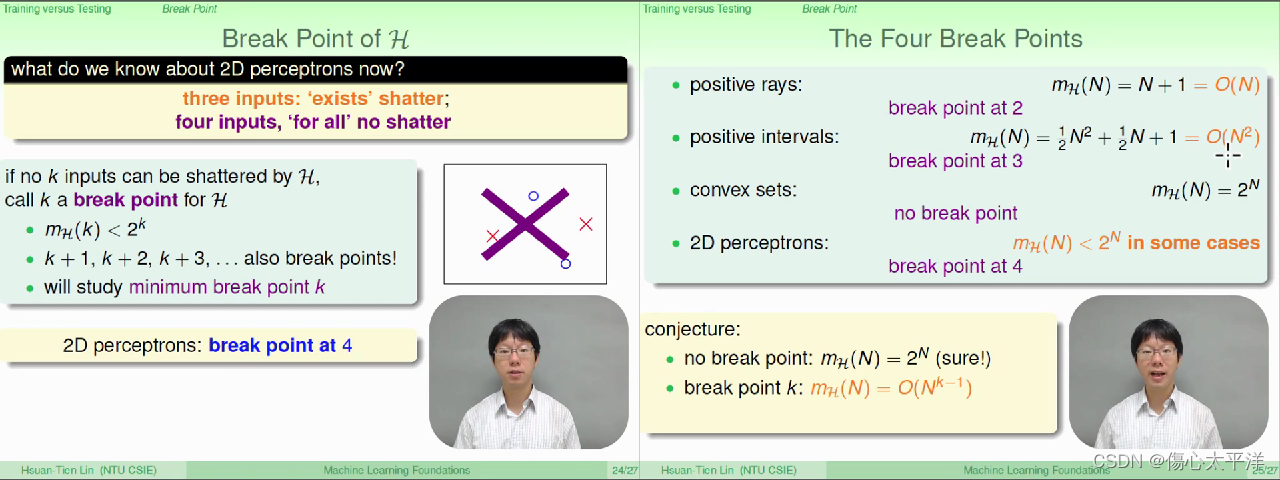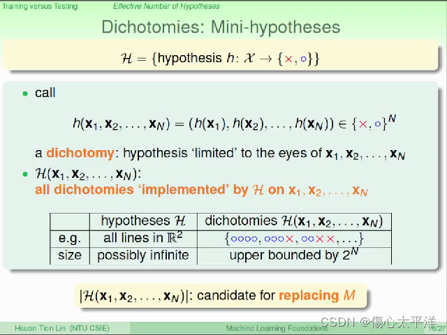 - 一个 Dichotomy 指的是 h 对于 N 个数据点的一种分类结果 (e.g. OOXXO)