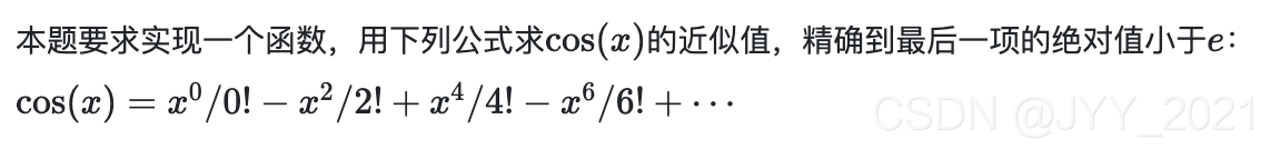 其中用户传入的参数为误差上限e和自变量x;函数funcos应返回用给定公式计算出来、并且满足误差要求的cos(x)的近似值。输入输出均在双精度范围内。