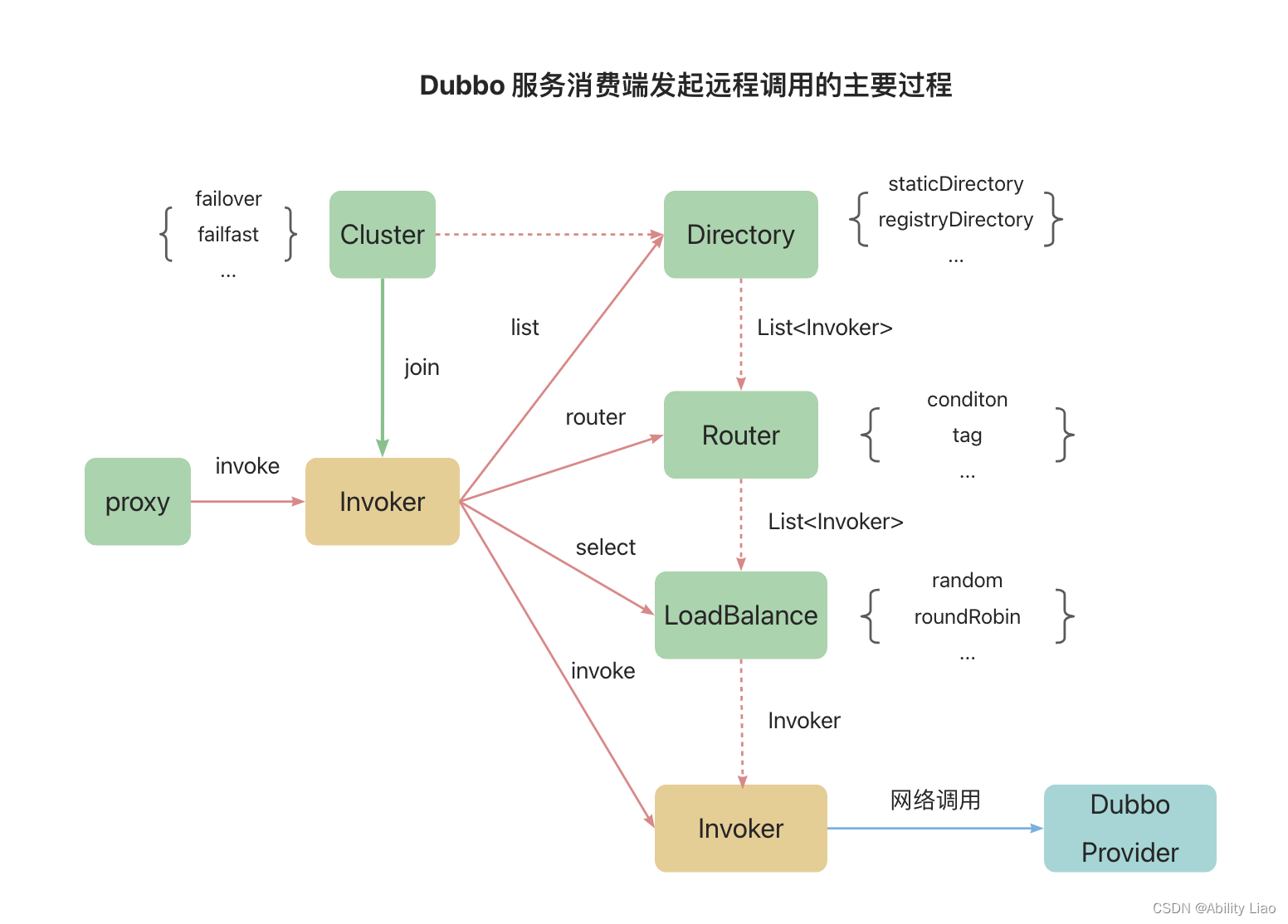 (1)服务消费端通过本地代理Proxy调用ClusterInvoker;