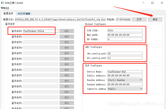 在这里可以修改蓝牙名,MAC地址(全FF为静态随机,即芯片烧录完后第一次供电会随机生成一个),可配置DAC增益和MIC增益,BLE相关配置。