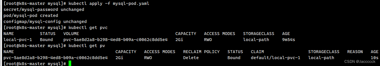 再次创建mysql-pod查看pvc与pv 自动创建了pv绑定成功