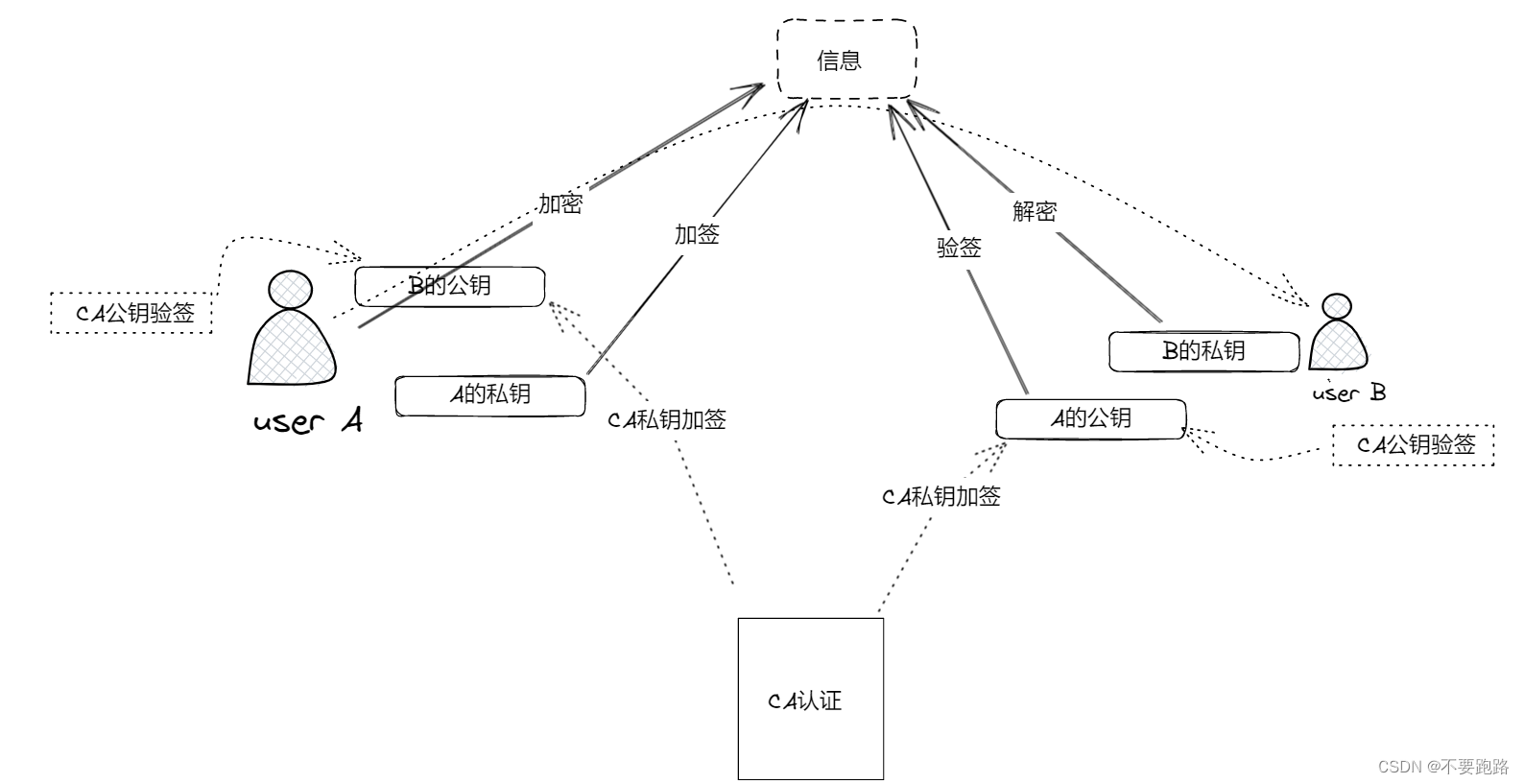 在此基础上再考虑一种情况 如果B手里的A的公钥被掉包成黑客自己的公钥 并且窃取的信息 他就可以用自己的私钥解开 造成信息泄露 所以出现了CA机构 (证书授权中心)