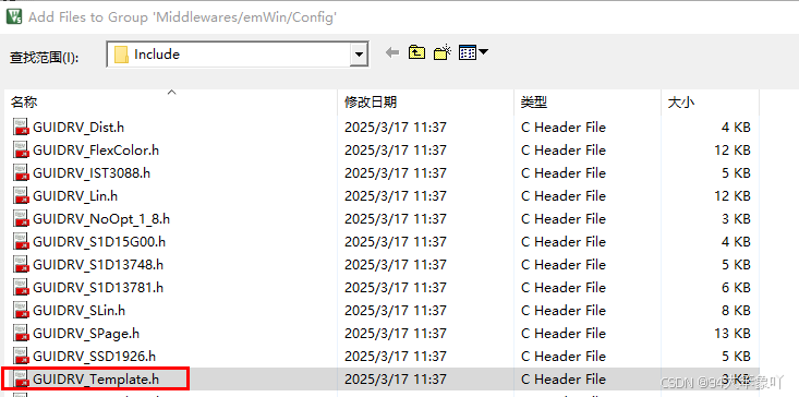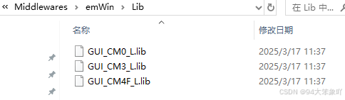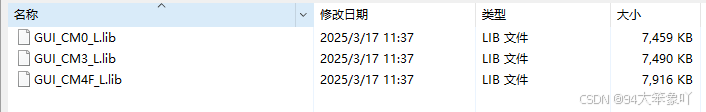 按对应内核选择,如果用户的 MCU 为 CM3 内核,则工程使用 GUI_CM3_L.lib 文件。GUI_CM4F_L.lib 文件只能使用在 CM4 以上的 MCU 内核。