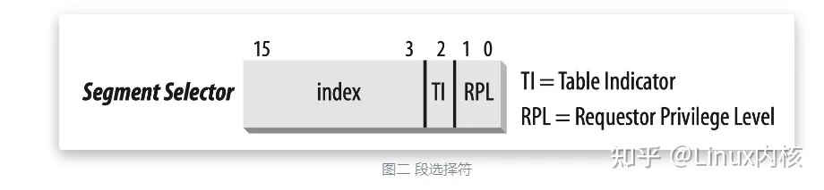逻辑地址 = 段标识符 (16位) + 段偏移量 (32位),我们又将段标识符称为段选择符,其结构如下图所示