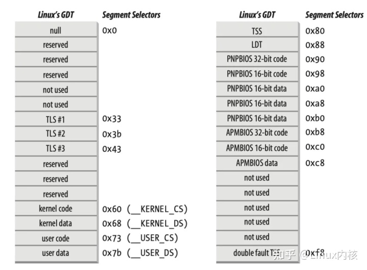 每个GDT包含 18个段描述符和14个空的保留项,保留项保证了常用的描述符可以在同一个32字节的 Cache 中,防止 Cache 抖动。