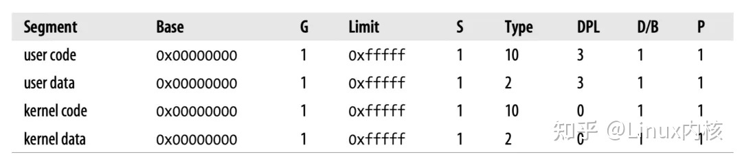 2.6版的Linux只有在 80x86 结构下才进行分段,下图为Linux的分段结构
