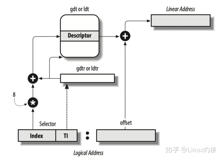图六已经较为清楚的展示了分段单元把逻辑地址转为虚拟地址的过程,段选择符在段寄存器中,offset存储在ip寄存器中