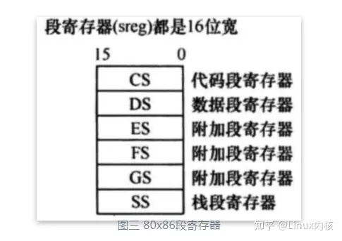 段寄存器存放段选择符,段寄存器共有 cs,ss,ds,es,fs和gs六个,其作用如图三所示。