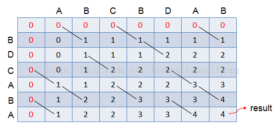 下面我用图标表示,两个字符串ABCBDAB与BDCABA这两个最长公共子序列,通过图表的方式以二维坐标模拟得到最后的结果,最长公共子序列是4,一共有3个,分别是:BCAB,BDAB,BCBA