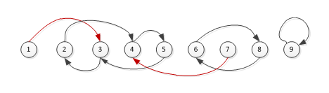如下图所示,崇拜关系用箭头表示,红色表示不在圈中。