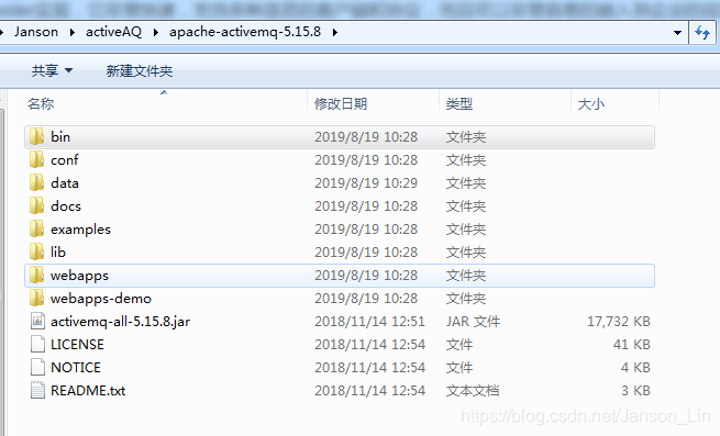 大家现在好之后,将apache-activemq-5.15.8-bin.zip解压缩,我们可以看到它的整体目录结构