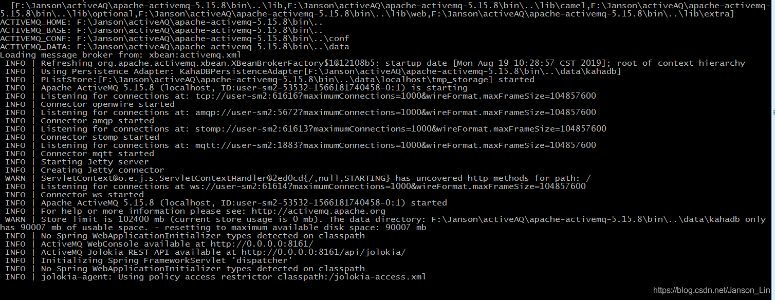 我们了解activemq的基本目录,下面我们运行一下activemq服务,双击bin目录下的activemq.bat脚本文件或运行自己电脑版本下的activemq.bat,就可以看下图的效果。