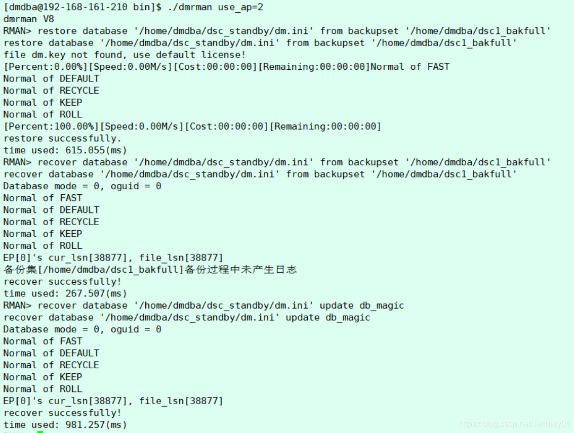 recover database '/home/dmdba/dsc_standby/dm.ini' from backupset '/home/dmdba/dsc1_bakfull'