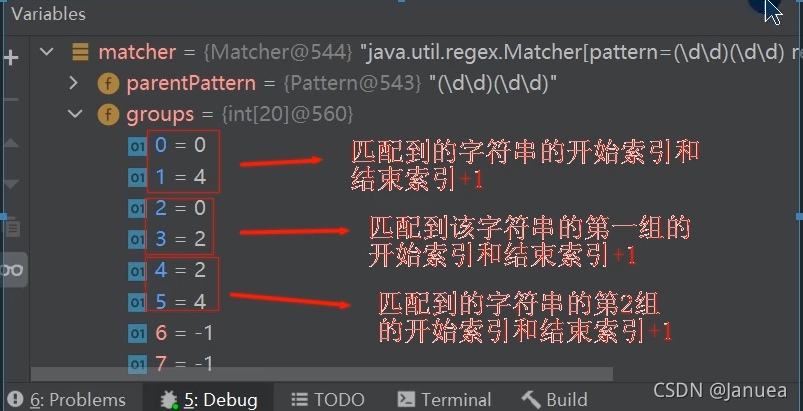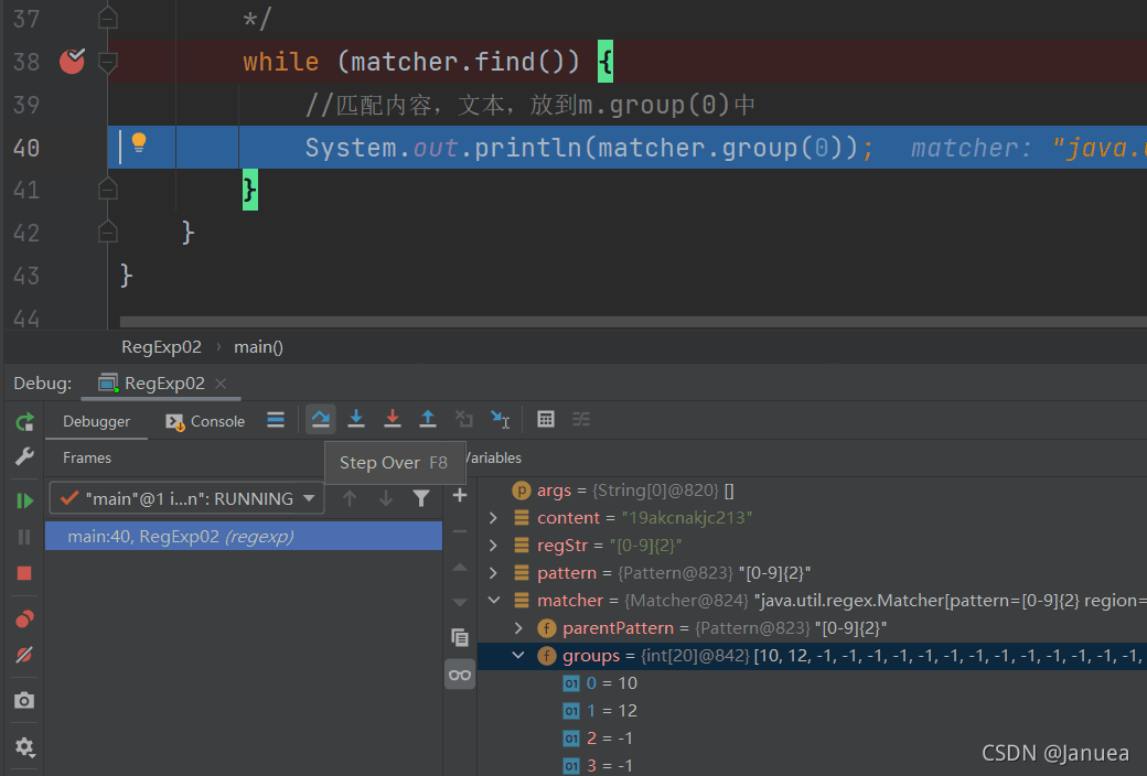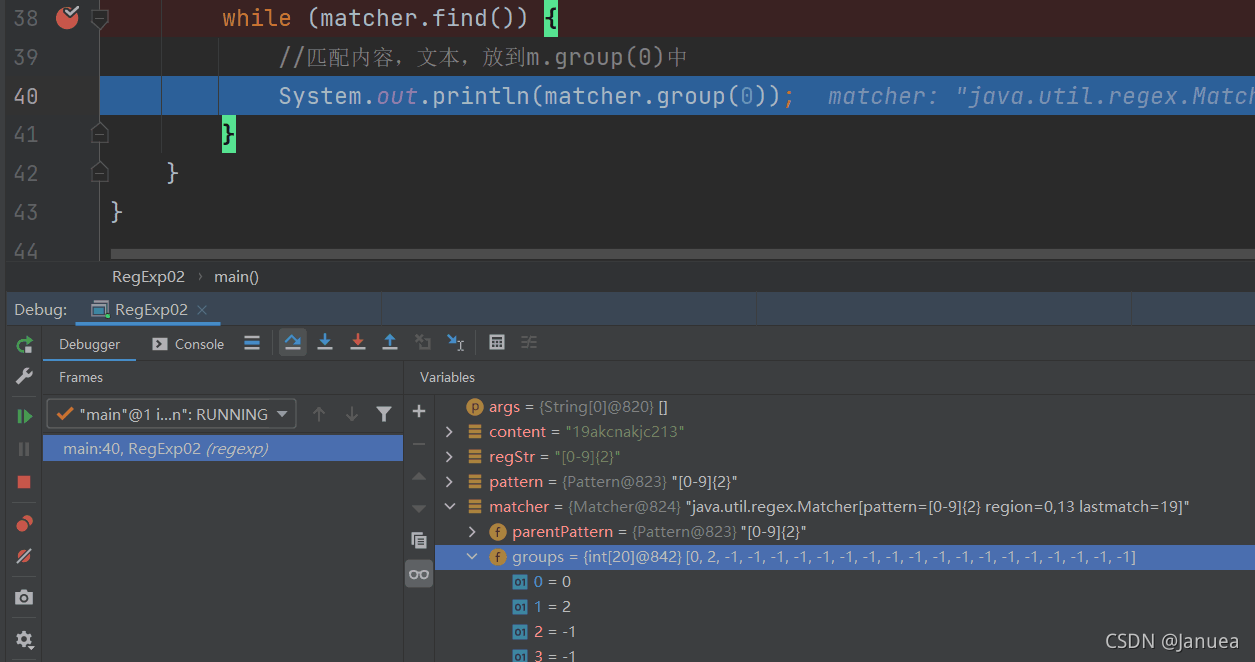 循环执行到下一次运行时,发现groups[0]=10,groups[0]=12,是因为匹配器matcher的find方法会清空上一次的记录