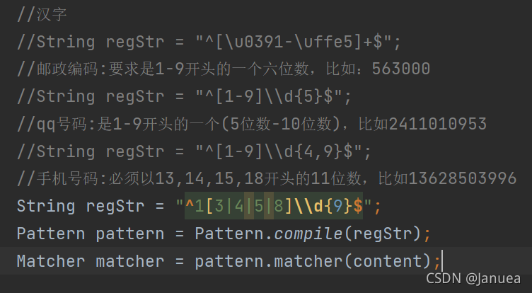 | $ | 指定结束字符 | ^[0-9]\\-[a-z]+$ | 以1个数字开头后连接字符“-”,并以至少一个小写字母结尾的字符串 | 1-a,3-xm |