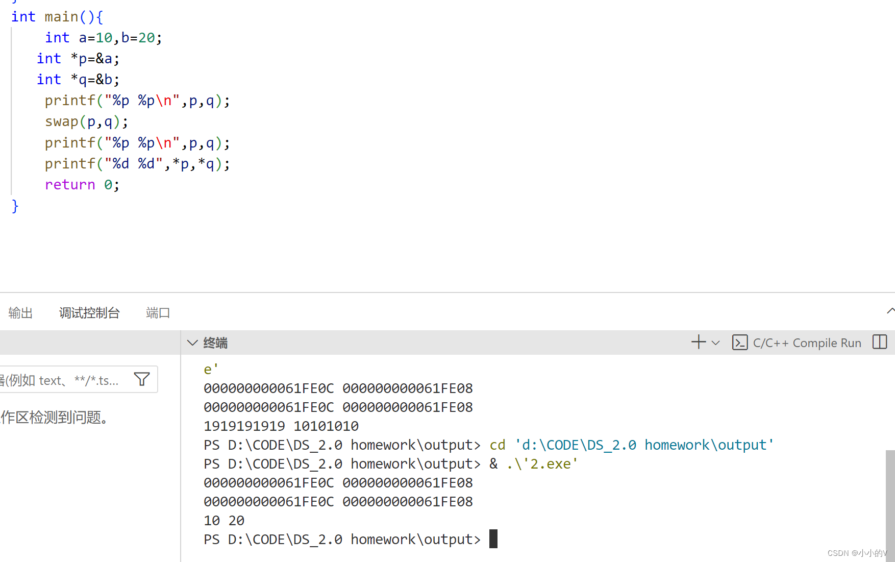 其实问题的本质是简单的,当你在函数中进行交换的时候,你只是在函数内部对函数的p和q变量进行了交换地址,而&a,&b本质上不是变量(即没有用一个新的变量名来对他们进行存储)而是一个值,所以无论怎样交换,只要你从函数中出来,a和b这两个变量还在,当你写&a,&b的时候,可以理解为又一次的对a和b进行取地址操作,他们俩的地址就不会改变,输出的值也不会改变。