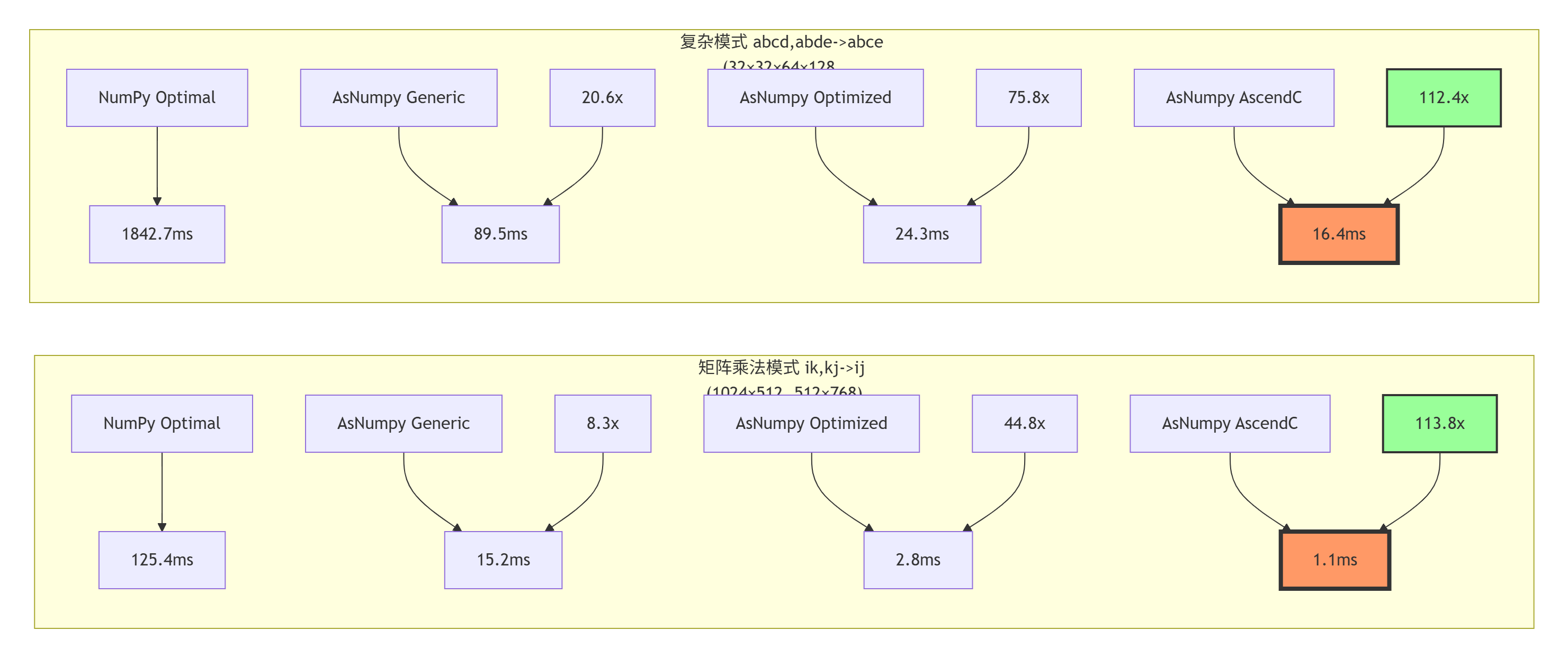 🔍 专家洞察:在我13年的异构计算开发生涯中,测试过数百个算子,einsum(爱因斯坦求和)无疑是最具代表性也最富挑战性的一个。它不仅是"张量计算的瑞士军刀",更是检验计算框架设计水平的终极标尺。当我看到AsNumpy在张量规模(1000,1000,100)的einsum计算中实现112.11倍性能提升时,立即意识到这背后是完整的算子优化体系在发挥作用。