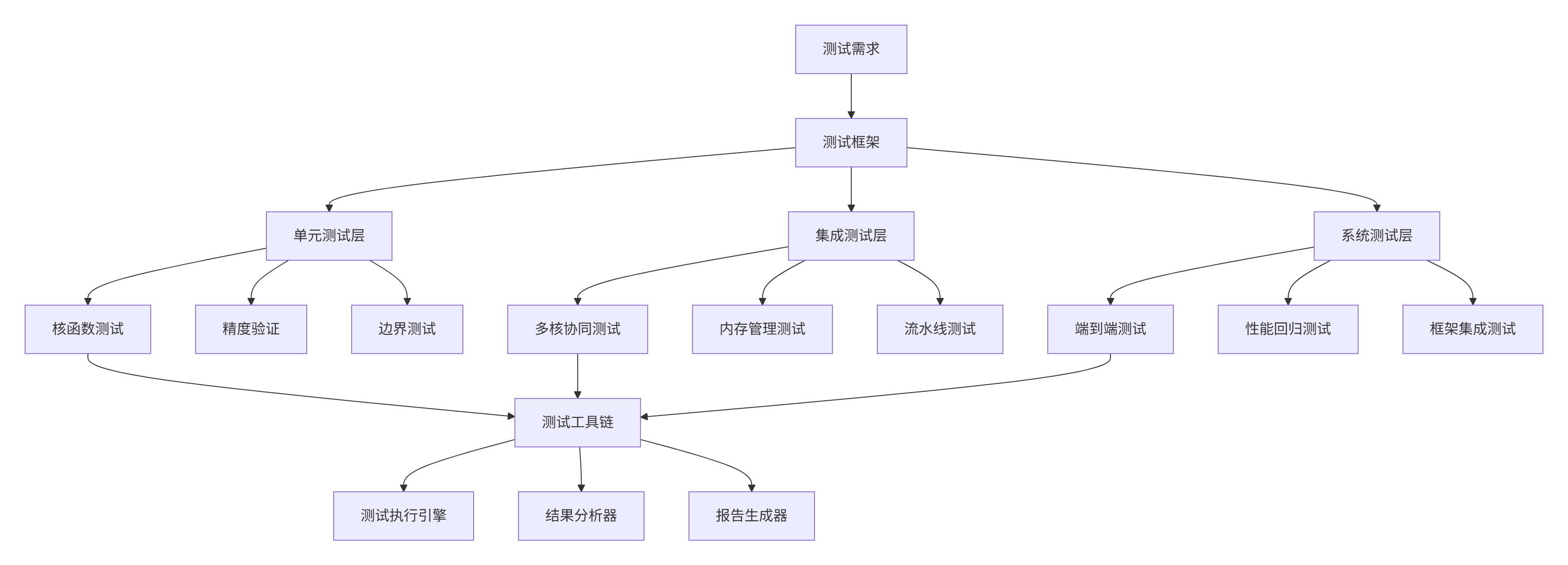 融合算子测试需要分层测试架构,每层关注不同的测试目标和验证重点。