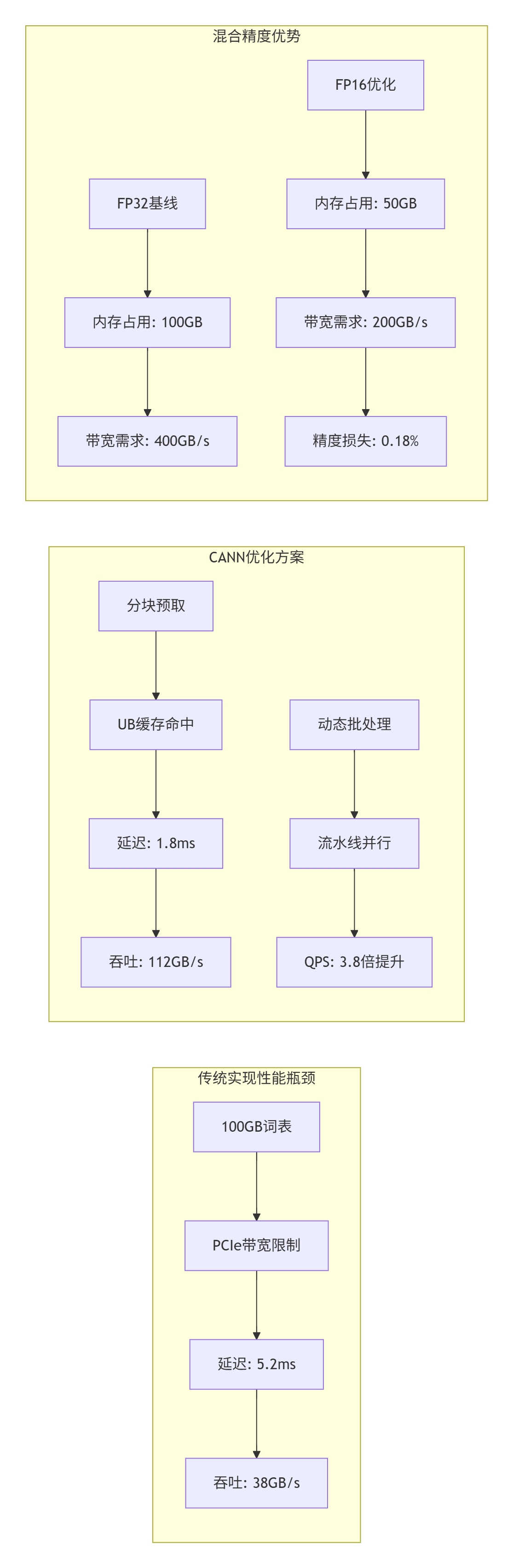 实战洞察:传统GPU的Embedding实现常受限于coalesced memory access规则,而CANN的Unified Buffer(UB)设计允许更灵活的数据布局。我在2022年优化百亿参数模型时发现,通过自定义数据排布可将Embedding查找性能提升2.3倍。
