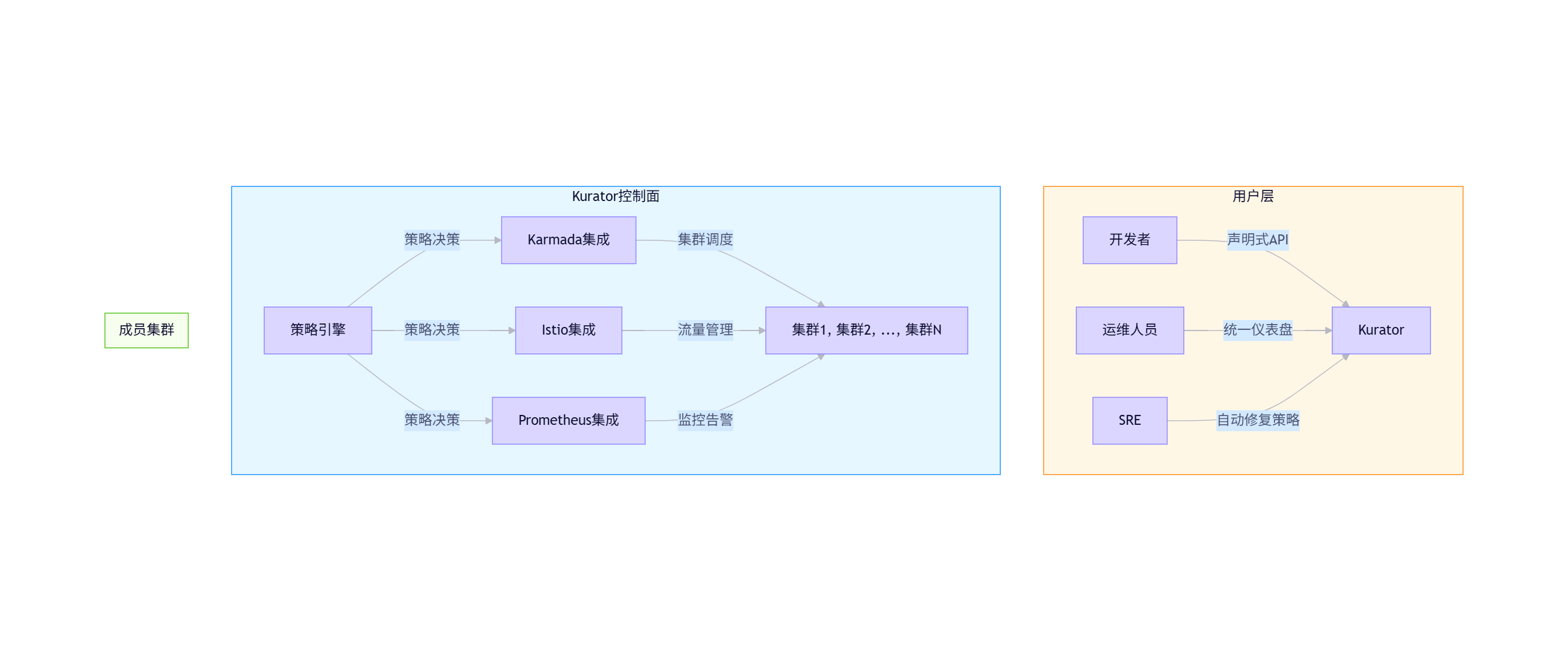 Karmada(Kubernetes Armada)作为CNCF沙箱项目,专注于多集群资源调度;而Kurator作为企业级分布式云原生平台,在Karmada基础上构建了统一控制面,整合了流量治理、策略管理、监控告警等能力。二者协同,形成了从基础设施到应用层的完整解决方案。