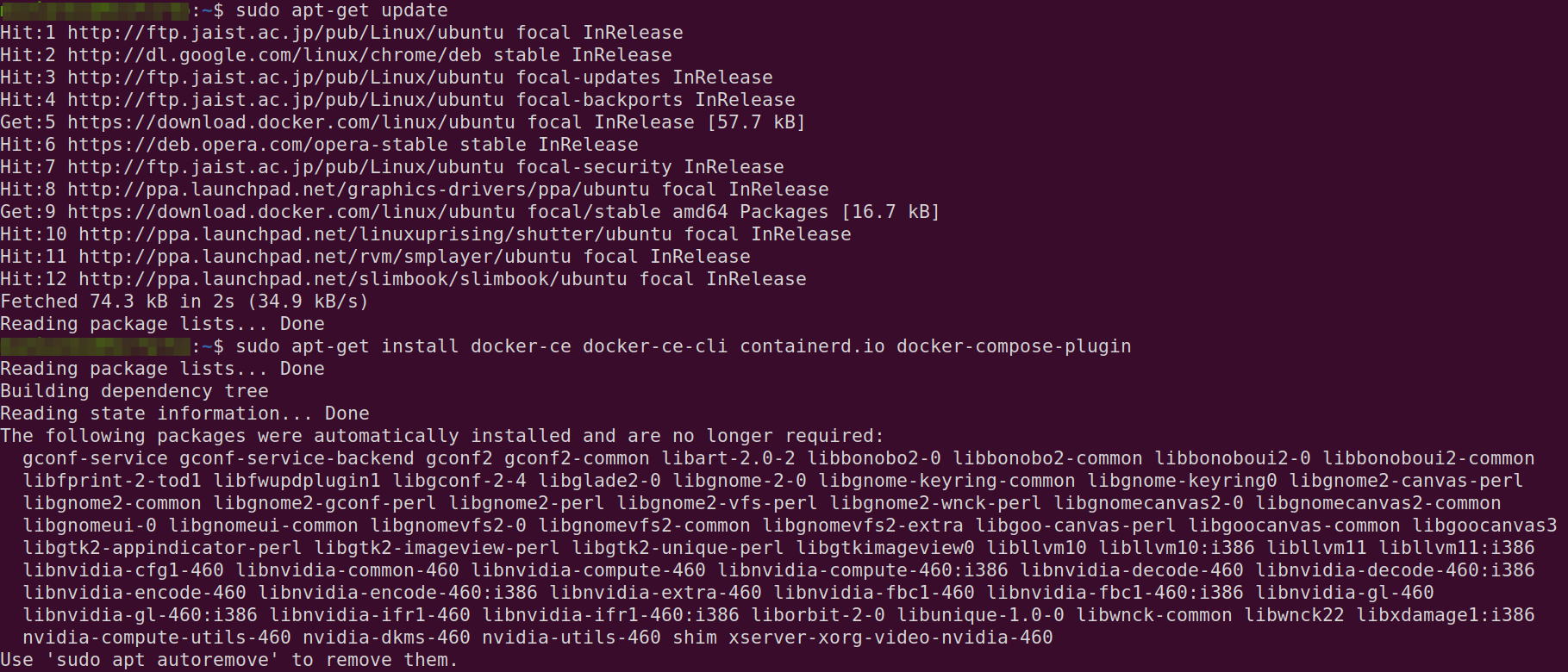 sudo apt-get install docker-ce docker-ce-cli containerd.io docker-compose-plugin