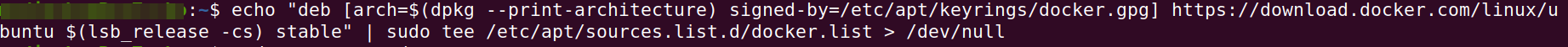 echo "deb [arch=$(dpkg --print-architecture) signed-by=/etc/apt/keyrings/docker.gpg] https://download.docker.com/linux/ubuntu $(lsb_release -cs) stable" | sudo tee /etc/apt/sources.list.d/docker.list > /dev/null