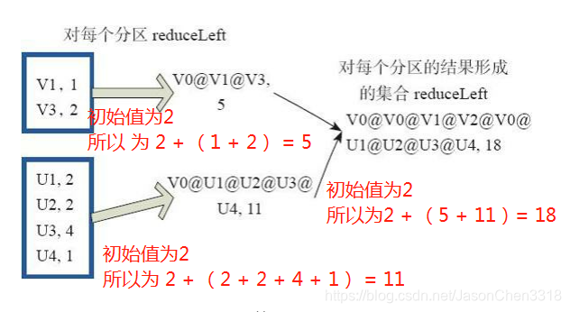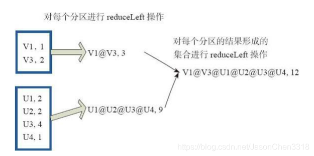 reduceLeft先对两个元素<K,V>进行reduce函数操作,然后将结果和迭代器取出的下一个元素<k,V>进行reduce函数操作,直到迭代器遍历完所有元素,得到最后结果。在RDD中,先对每个分区中的所有元素<K,V>的集合分别进行reduceLeft。 每个分区形成的结果相当于一个元素<K,V>,再对这个结果集合进行reduceleft操作。