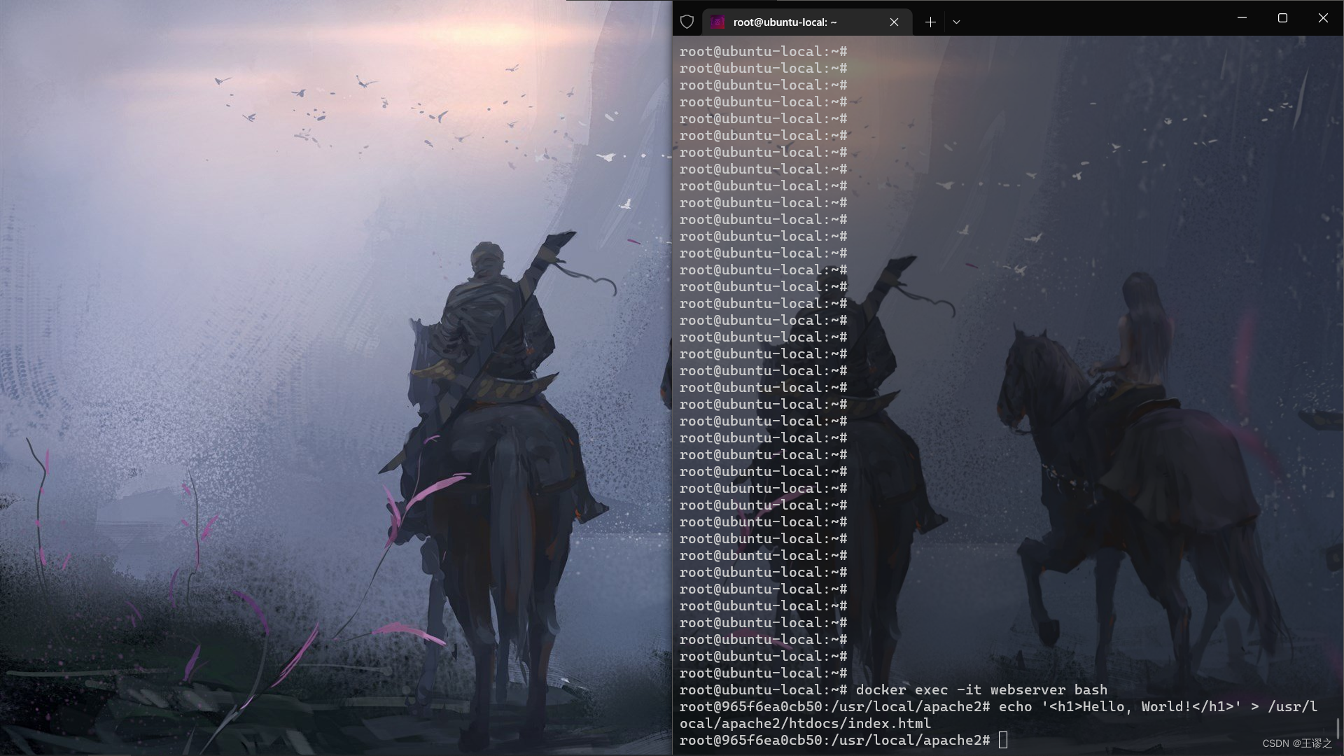 docker exec -it webserver bash echo '<h1>Hello, World!</h1>' > /usr/local/apache2/htdocs/index.html