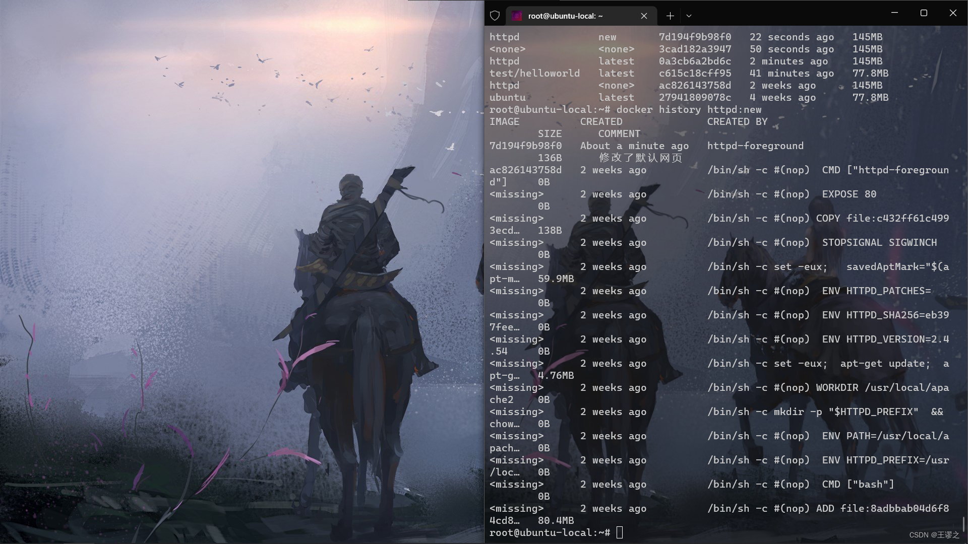 docker history具体查看镜像内的历史记录,我们会发现新增了我们刚刚提交的这一层。