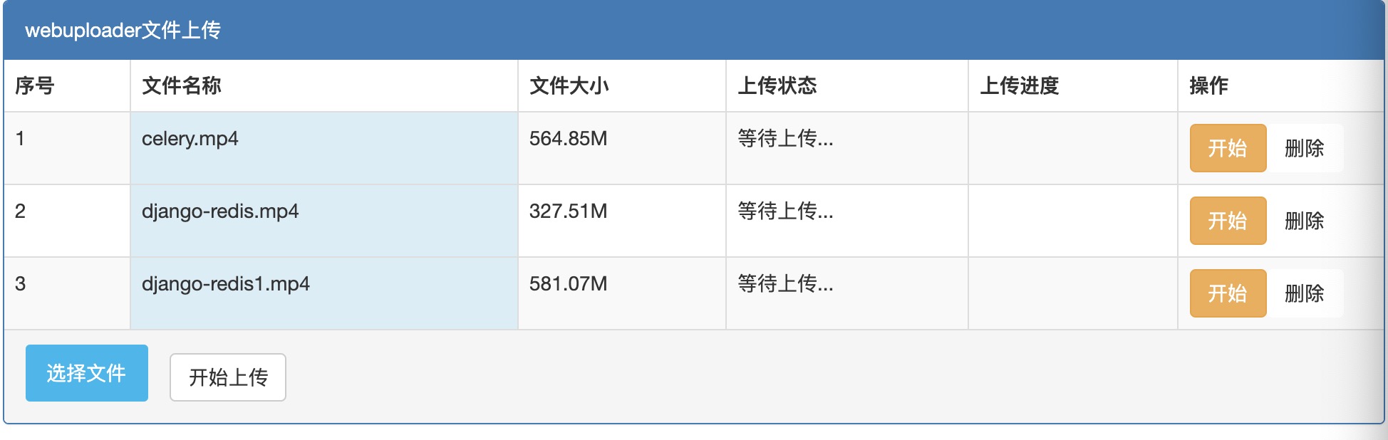 <!DOCTYPE html> <html> <head> <meta charset="UTF-8"> <title>webuploader上传</title> {#<link rel="stylesheet" type="text/css" href="https://cdnjs.cloudflare.com/ajax/libs/webuploader/0.1.1/webuploader.css">#} {#<link rel="stylesheet" type="text/css" href="https://cdn.jsdelivr.net/npm/bootstrap@3.3.7/dist/css/bootstrap.min.css">#} <link rel="stylesheet" type="text/css" href="/static/webuploader/webuploader.css"> <link rel="stylesheet" type="text/css" href="/static/bootstrap/css/bootstrap.min.css"> <script src="/static/jquery-2.2.3.min.js"></script> <script src="/static/webuploader/webuploader.min.js"></script> <script type="text/javascript" src="/static/hashmap.js"></script> <style type="text/css"> #picker { display: inline-block; line-height: 1.428571429; vertical-align: middle; margin: 0 12px 0 0; } </style> </head> <body> <div id="uploader" class="container"> <!--用来存放文件信息--> <div id="thelist" class="row"> <div class="panel panel-primary"> <div class="panel-heading">webuploader文件上传</div> <table class="table table-striped table-bordered" id="uploadTable"> <thead> <tr> <th>序号</th> <th>文件名称</th> <th>文件大小</th> <th>上传状态</th> <th>上传进度</th> <th style="width:15%;">操作</th> </tr> </thead> <tbody></tbody> </table> <div class="panel-footer"> <div id="picker">选择文件</div> <button id="btn" class="btn btn-default">开始上传</button> </div> </div> </div> </div> <script type="text/javascript"> var fileMd5; var fileSuffix; var $list=$("#thelist table>tbody"); var state = 'pending';//初始按钮状态 var $btn=$("#btn"); var count=0; var map=new HashMap(); //监听分块上传过程中的三个时间点 WebUploader.Uploader.register({ "before-send-file" : "beforeSendFile", "before-send" : "beforeSend", "after-send-file" : "afterSendFile", }, { //时间点1:所有分块进行上传之前调用此函数 beforeSendFile : function(file) { var deferred = WebUploader.Deferred(); //1、计算文件的唯一标记,用于断点续传 // (new WebUploader.Uploader()).md5File(file, 0, 10 * 1024 * 1024) (new WebUploader.Uploader()).md5File(file, 0, 1024) .progress(function(percentage) { $('#' + file.id).find("td.state").text("正在读取文件信息..."); }).then(function(val) { fileMd5 = val; $('#' + file.id).find("td.state").text("成功获取文件信息..."); //获取文件信息后进入下一步 deferred.resolve(); }); return deferred.promise(); }, //时间点2:如果有分块上传,则每个分块上传之前调用此函数 beforeSend : function(block) { var deferred = WebUploader.Deferred(); $.ajax({ type : "POST", url : "{% url 'checkChunk'%}", data : { //文件唯一标记 fileMd5 : fileMd5, //当前分块下标 chunk : block.chunk, //当前分块大小 chunkSize : block.end - block.start }, dataType : "json", success : function(response) { if (response.ifExist) { //分块存在,跳过 deferred.reject(); } else { //分块不存在或不完整,重新发送该分块内容 deferred.resolve(); } } }); this.owner.options.formData.fileMd5 = fileMd5; deferred.resolve(); return deferred.promise(); }, //时间点3:所有分块上传成功后调用此函数 afterSendFile : function(file) { //如果分块上传成功,则通知后台合并分块 $.ajax({ type : "POST", url : "{% url 'mergeChunks'%}", data : { fileId : file.id, fileMd5 : fileMd5, fileSuffix:fileSuffix, fileName:file.name, }, success : function(response) { console.log(response.fileName+" 上传成功") $('#del'+file.id).hide(); } }); } }); var uploader = WebUploader .create({ // swf文件路径 swf : 'https://cdnjs.cloudflare.com/ajax/libs/webuploader/0.1.1/Uploader.swf', // 文件接收服务端。 server : "{% url 'upload' %}", // 选择文件的按钮。可选。 // 内部根据当前运行是创建,可能是input元素,也可能是flash. pick : { id : '#picker',//这个id是你要点击上传文件的id multiple : true }, // 不压缩image, 默认如果是jpeg,文件上传前会压缩一把再上传! resize : true, auto : false, //开启分片上传 chunked : true, chunkSize : 10 * 1024 * 1024, accept : { extensions : "txt,jpg,jpeg,bmp,png,zip,rar,war,pdf,cebx,doc,docx,ppt,pptx,xls,xlsx,iso,flv,mp4", mimeTypes : '.txt,.jpg,.jpeg,.bmp,.png,.zip,.rar,.war,.pdf,.cebx,.doc,.docx,.ppt,.pptx,.xls,.xlsx,.iso,.flv,.mp4' } }); // 当有文件被添加进队列的时候 uploader.on('fileQueued', function(file) { //保存文件扩展名 fileSuffix=file.ext; fileName=file.source['name']; var fileSize=file.size; var fileSizeStr=""; fileSizeStr=WebUploader.Base.formatSize(fileSize); count++; $list.append( '<tr id="' + file.id + '" class="item" flag=0>'+ '<td class="index">' + count + '</td>'+ '<td class="info">' + file.name + '</td>'+ '<td class="size">' + fileSizeStr + '</td>'+ '<td class="state">等待上传...</td>'+ '<td class="percentage"></td>'+ '<td class="operate"><button name="upload" id="del'+file.id+'" class="btn btn-warning">开始</button><button name="delete" class="btn btn-error">删除</button></td></tr>'); map.put(file.id+"",file); }); // 文件上传过程中创建进度条实时显示。 uploader.on('uploadProgress', function(file, percentage) { $('#' + file.id).find('td.percentage').text( '上传中 ' + Math.round(percentage * 100) + '%'); }); uploader.on('uploadSuccess', function(file) { $('#' + file.id).find('td.state').text('已上传'); }); uploader.on('uploadError', function(file) { $('#' + file.id).find('td.state').text('上传出错'); }); uploader.on('uploadComplete', function(file) { uploader.removeFile(file); }); uploader.on('all', function(type) { if (type === 'startUpload') { state = 'uploading'; } else if (type === 'stopUpload') { state = 'paused'; } else if (type === 'uploadFinished') { state = 'done'; } if (state === 'uploading') { $btn.text('暂停上传'); } else { $btn.text('开始上传'); } }); $btn.on('click', function(){ if (state === 'uploading'){ uploader.stop(true); } else { uploader.upload(); } }); $("body").on("click","#uploadTable button[name=