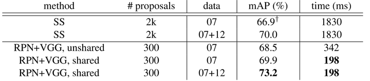 使用RPN+VGG下,用PASCAL VOC 07、12、07+12数据集的结果(shared代表共享特征层)。