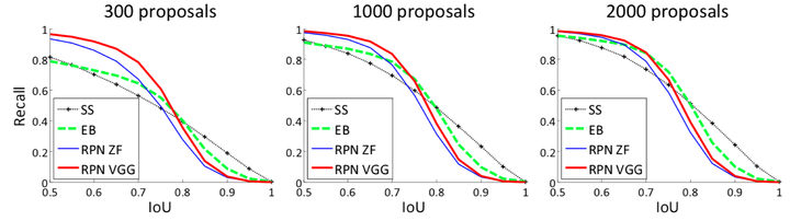0.3k,1k,2k个proposals下,不同算法的Recall和IoU的变化曲线