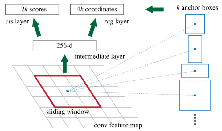 为了能够生成region proposal,这里在上面生成最后一层feature map后,还n × n 的slding window(具体实现是n × n的卷积后跟上两个1 x 1的卷积层,一个用来生成分类信息[cls,score],一个用来位置信息[x,y,w,h]),如下图所示: