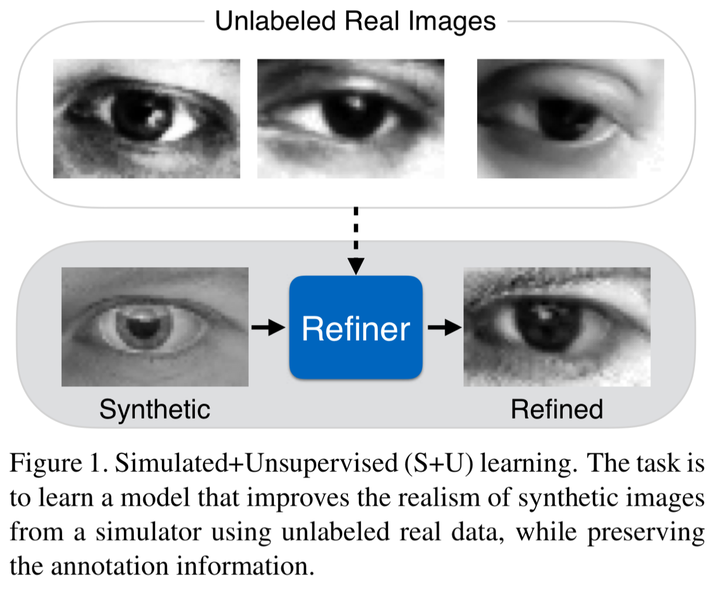 目前深度学习很多都是用生成的数据进行训练,而不是真实的数据,但是这么做就可能不能使模型拿到非常好的效果,因为生成数据和真实数据还是有一定差别的。因此,本文所做的就是提出了S+U learning,使用unlabeled real data去生成图片,在MPIIGaze是实现SOTA