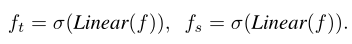 为了清楚地阐述LBDT模块中的传输过程,以编码器的第s级为例,为了简单起见,省略了上标s。作者改变了两个空间特征和时间特征的通道数通过线性变换转换为:
