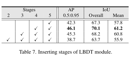 作者评估了LBDT模块的不同插入位置,并将结果总结在上表中。将LBDT插入空间和时间编码器的第4和第5阶段可以带来显著的改进。
